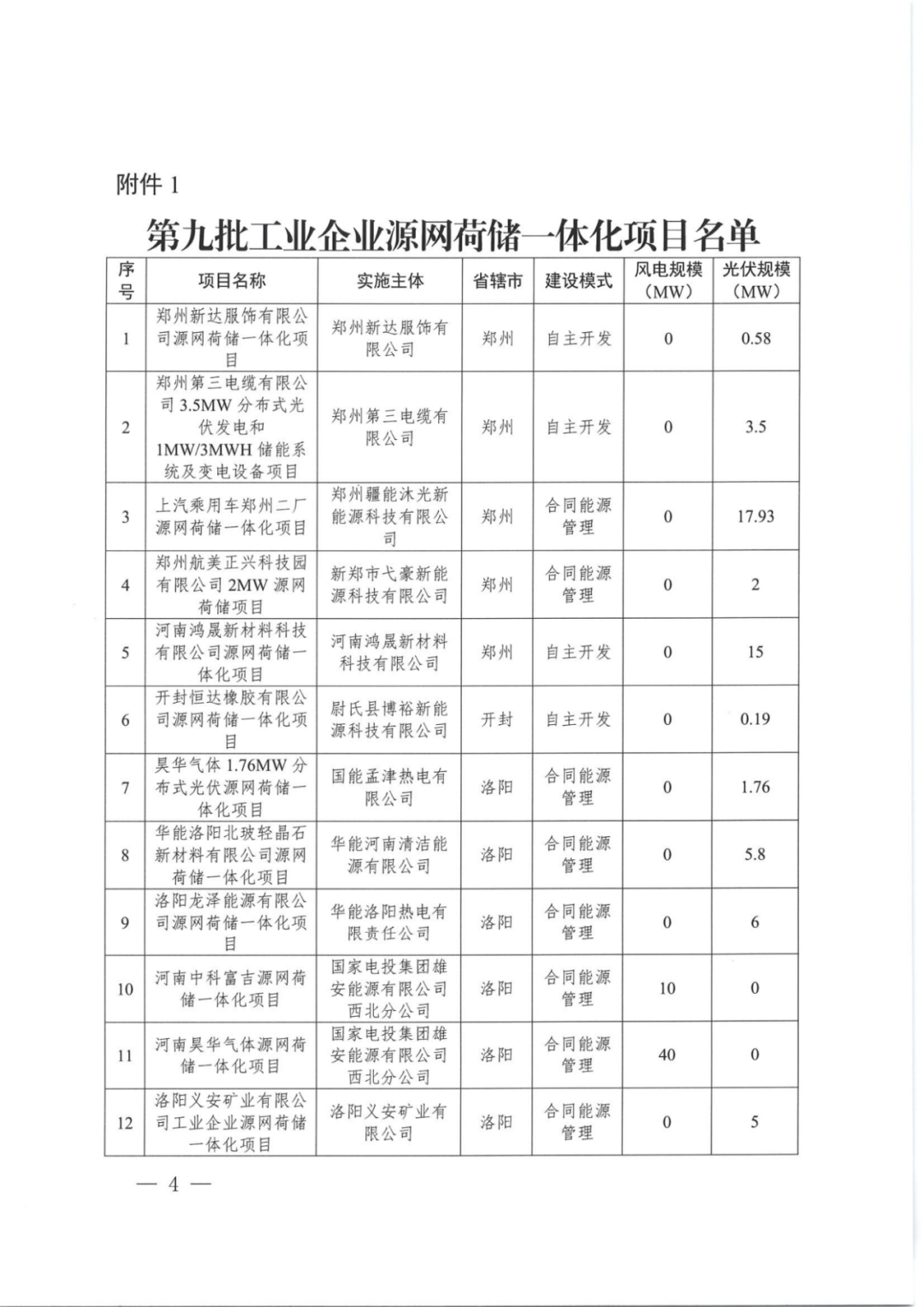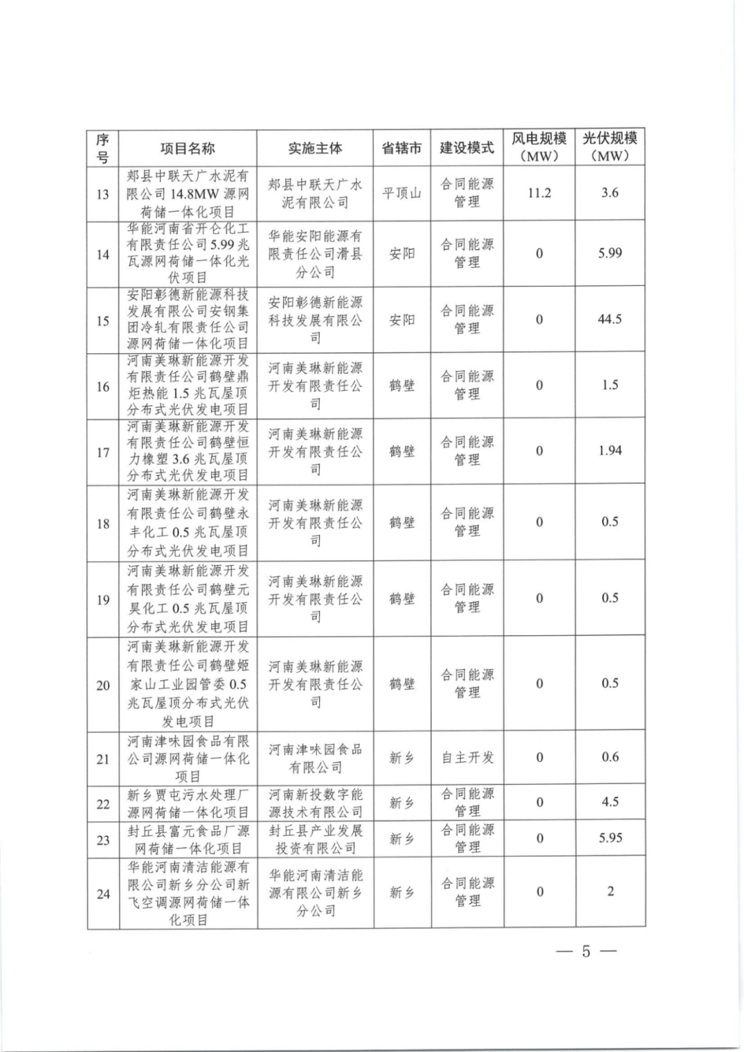 2024年12月20日,河南省发改委印发《关于实施第五批源网荷储一体化项目的通知》,其中提到,根据各地报送的源网荷储一体化项目(以下简称“一体化项目”)有关情况,河南发改委会同有关部门委托第三方机构进行了评估,工业企业类49个、增量配电网类4个、农村地区类8个项目(见附件)纳入第五批实施范围。本批源网荷储一体化项目共涉及823.999MW新能源,其中包括511.1MW风电,312.899MW光伏。