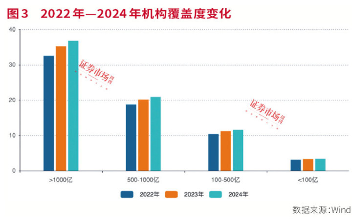 过去三年间,A股市场机构覆盖呈现“马太效应”。Wind数据显示,2024年市值超千亿的公司平均获得36.8家机构覆盖,较2022年的32.5家增长13.2%,同期百亿以下公司的覆盖度仅从3.1家微增至3.4家。这种分化在资金端表现更为显著,2024年市值前10%公司吸纳机构持仓总量的68%,较2022年提升7%。