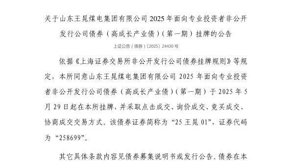 依据《上海证券交易所非公开发行公司债券挂牌规则》等规定,上交所同意山东王晁煤电集团有限公司2025年面向专业投资者非公开发行公司债券(高成长产业债)(第一期)于2025年5月29日起在上交所挂牌,并采取点击成交、询价成交、竞买成交、协商成交交易方式。该债券证券简称为“25王晁01”,证券代码为“258699”。